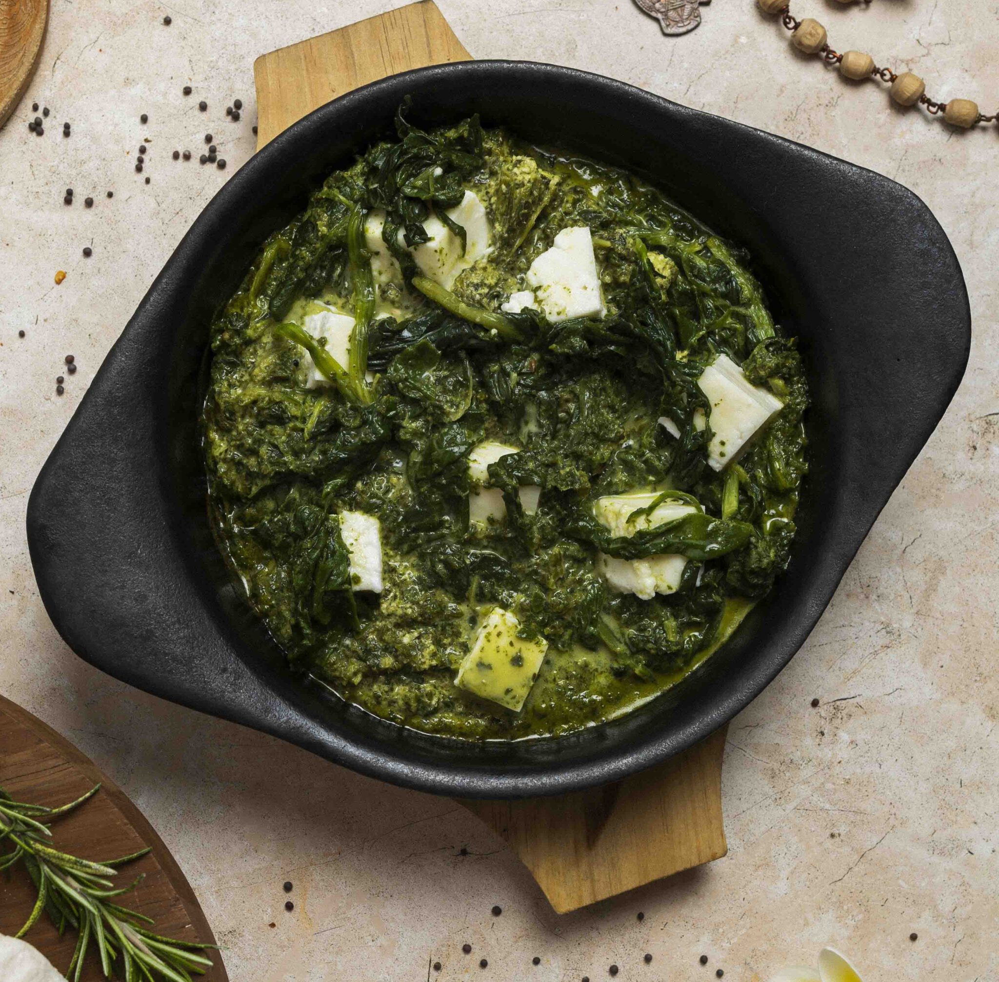 Espinacas y queso cocinados en especias.