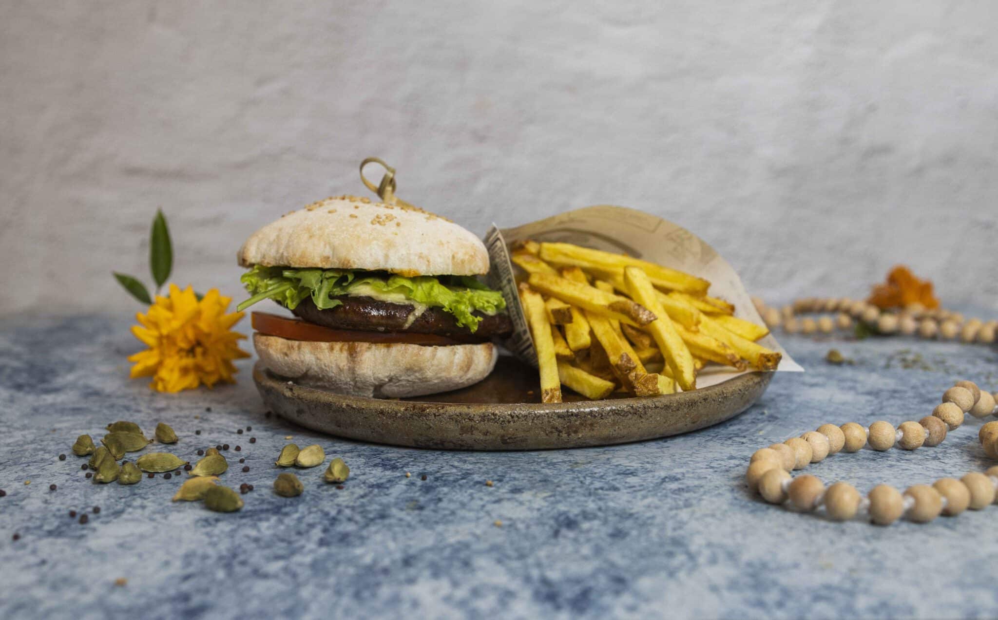 Hamburguesas de remolacha y seitan con patatas fritas y salsas.