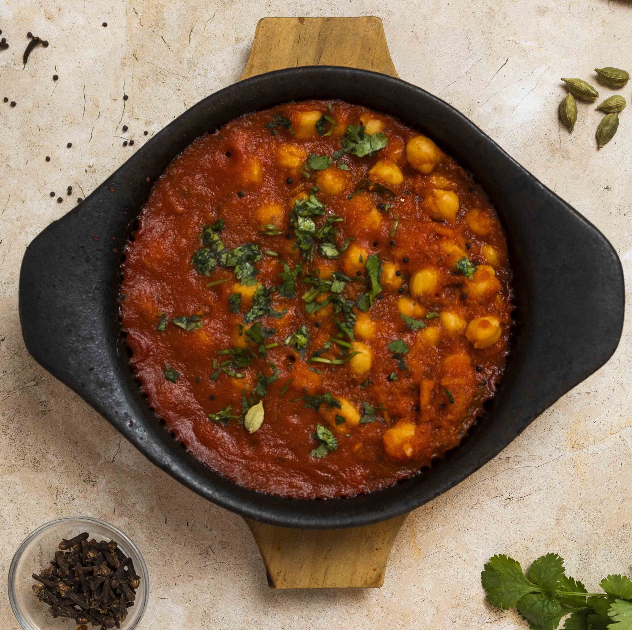 Garbanzos cocinados con cominos y tomate en una masala especial.