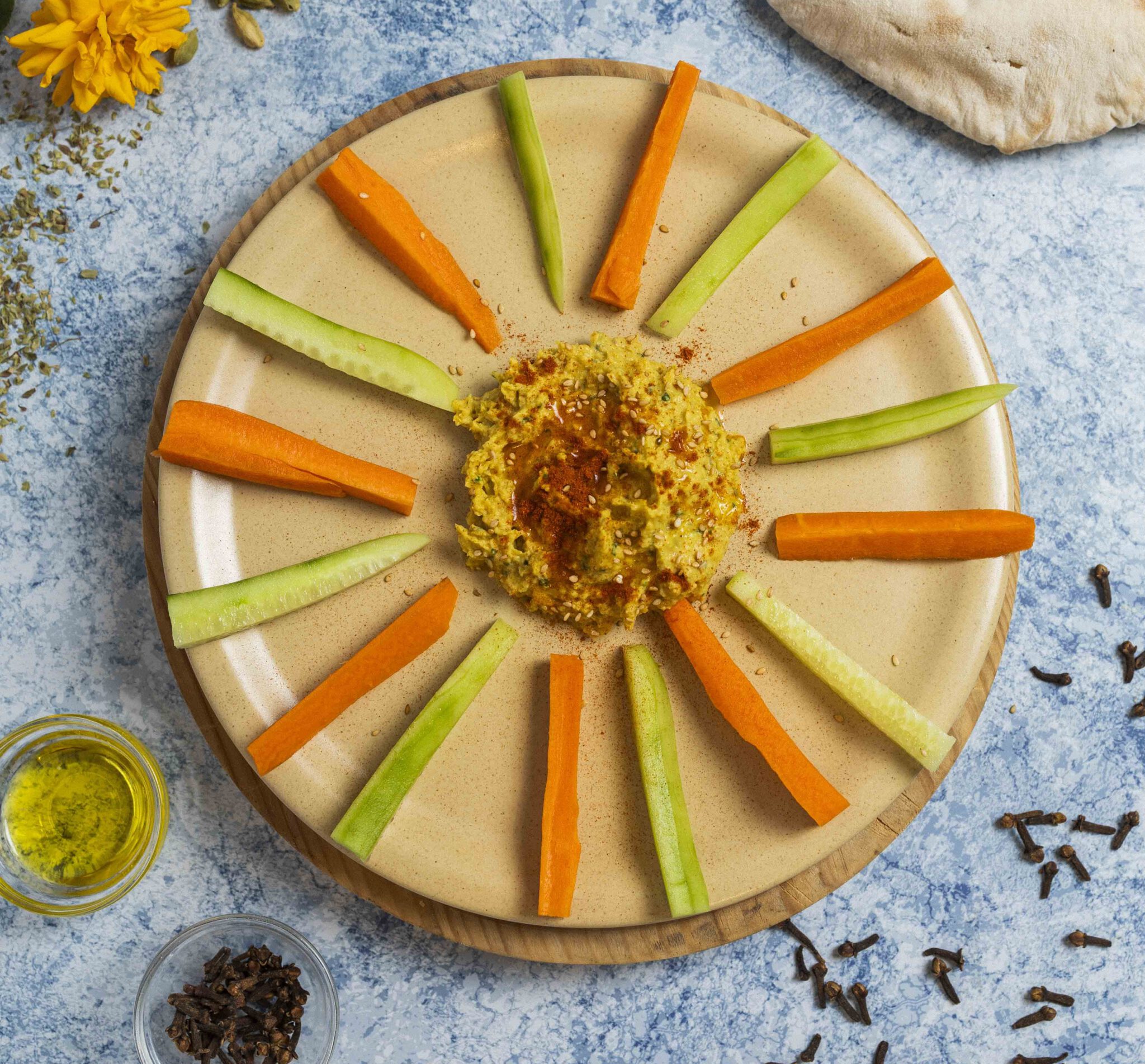 Crema de garbanzos con verduras crujientes.