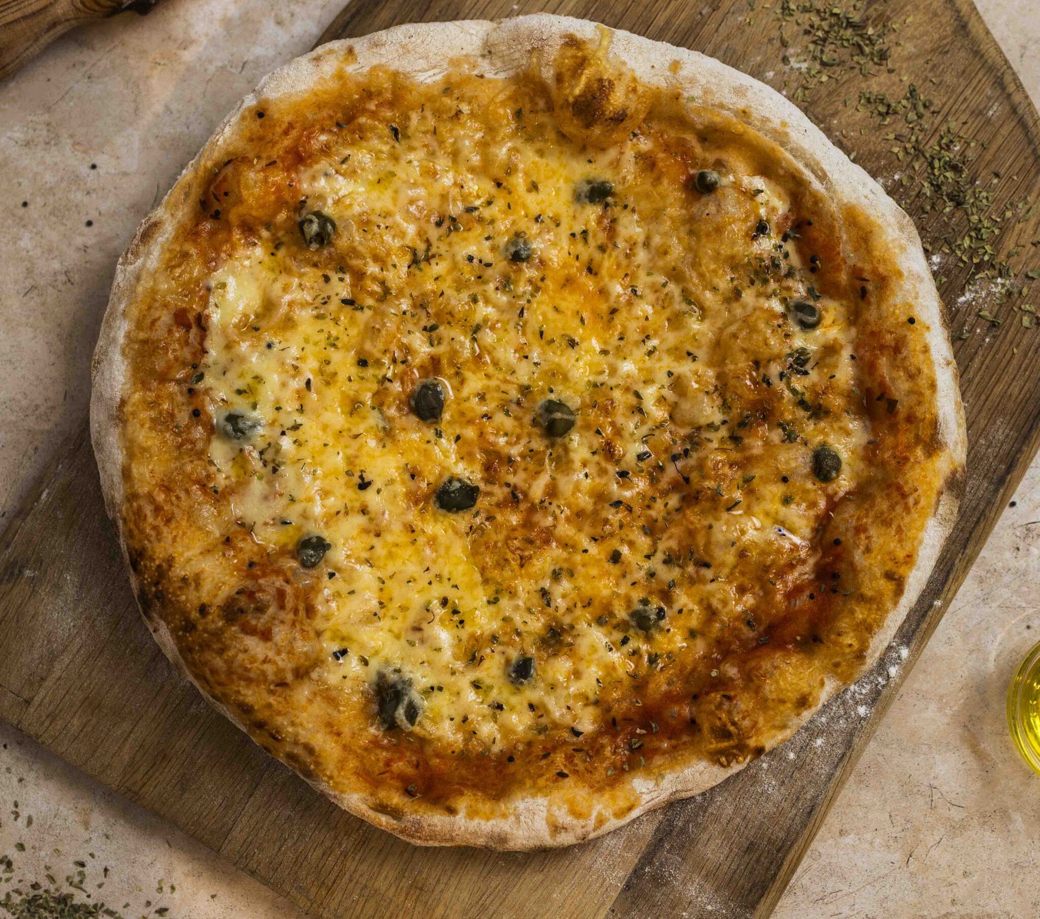 Salsa de tomate, edamer, mozzarella, queso azul y queso fresco, orégano, aceite de oliva y sal.